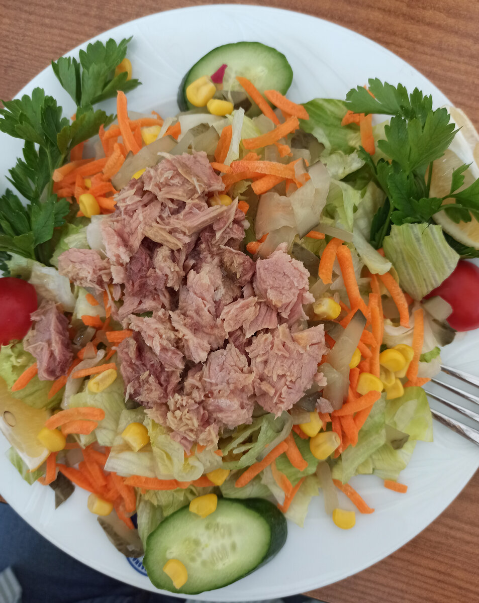 Салат, который никого не оставит равнодушным - это овощной салат с консервированным тунцом. Ребята, это просто отвал башки! Он и лёгкий, и сытный и просто очень вкусный! Его легко сделать дома. Даже если каких-то ингредиентов не оказалось в холодильнике, можно просто не добавлять их и всё равно получится вкусно! Необходимые ингредиенты: листья салата Айсберг, солёные огурцы, свежая морковь, консервированная кукуруза, банка консервированного тунца в масле, помидорки черри, свежий огурец, зелень для украшения. Для заправки нам нужен свежий лимон, растительное или оливковое масло, соль, гранатовый соус. Процесс готовки (выкладываем слоями): Заправку делаем так: режем на дольки лимон и выдавливаем сверху на салат (на порцию хватит двух-трёх долек лимона), солим, поливаем растительным/оливковым маслом, затем выливаем тонкой струйкой гранатовый соус (главное, не переборщить, иначе будет очень кисло и салат будет сложно исправить). Всё готово! Можно есть, не перемешивая, захватывая вилкой