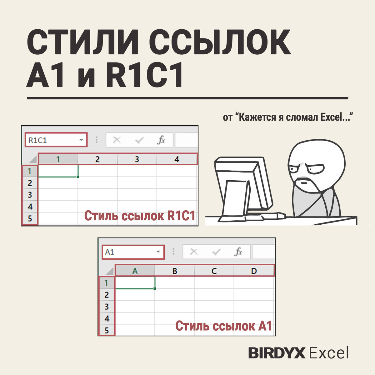 Часто при работе с таблицей Excel происходит изменение привычного нам стиля ссылок А1 (где строки обозначены цифрами, а столбцы - буквами), на стиль ссылок R1C1 (где и строки и столбцы обозначаются цифрами). 💢Часть пользователей страдают в поисках ответа на вопрос "Что я сделал? Как все вернуть обратно?" 💢Другая часть (будете удивлены, но так оно и есть) даже НЕ подозревают, что есть удобный стиль ссылок А1. Они работают со стилем R1C1 отчего считают, что Excel это суперсложно и непонятно. 💢Ну и третья часть, это наши подписчики, которые теперь знают, что отключить стиль ссылок R1C1 очень просто! :) ☝🏻Стиль ссылок R1C1 распространен в Европе, а также среди тех, кто работает с VBA. Для большинства пользователей, этот стиль ссылок абсолютно непонятен и только сбивает с толку. 🙌🏻К счастью, отключить его и вернуться к привычному стилю ссылок А1 очень просто: 1. Нажмите на вкладку "Файл" 2. Выберите "Параметры" 3. Далее откройте вкладку "Формулы" 4. В разделе "Работа с формулами" сн