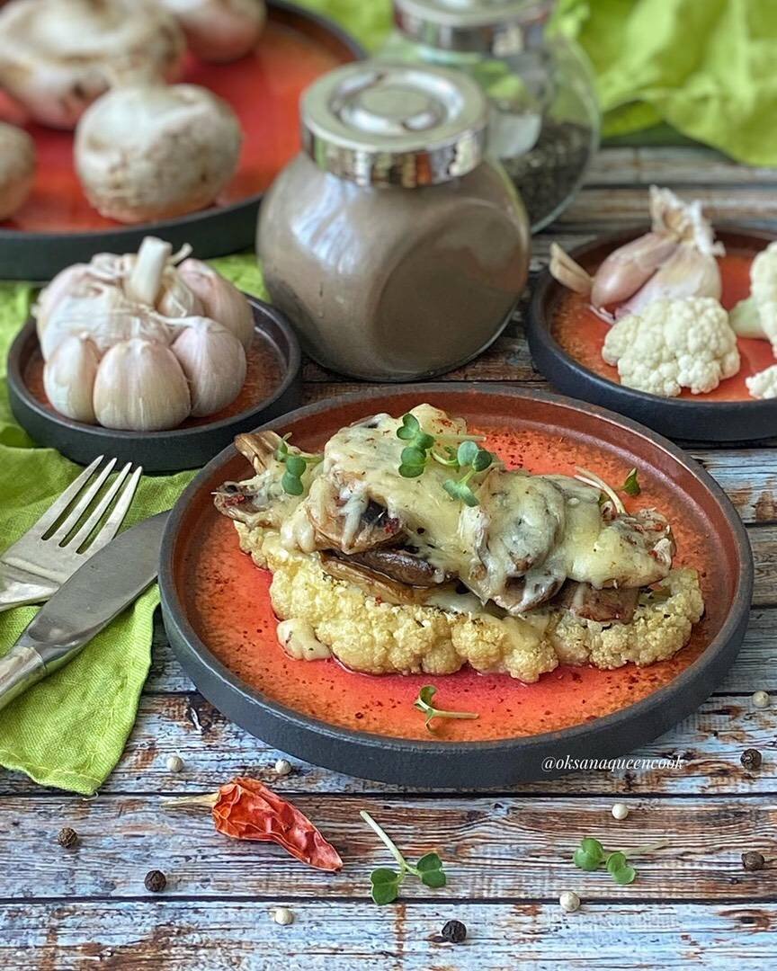 #академия #готовимдома #цветнаякапуста #домашняяеда #едаялюблютебя #закуски Ингредиенты: — Цветная капуста, — Грибы шампиньоны, — Сыр пармезан, — Чеснок, Масло раст., Соль , Перец чёрный молотый , Прованские травы Способ приготовления: У цветной капусты удалить листья и выступающую часть кочерыжки. Тщательно промыть, обсушить и нарезать на пластины толщиной примерно 2 см. Смазать раст.маслом с двух сторон. Посолить, поперчить с обеих сторон, добавить прованские травы по вкусу. Запекать в духовке 20 мин. при температуре 180°С. Грибы помыть, обсушить, нарезать тонкими пластинками. Раздавленный зубчик чеснока прогреть в растительном масле и обжарить грибы на большом огне пару минут до золотистого цвета, пока они не пустили сок. Затем чеснок удалить. Выложить на стейки пластинки сыра, сверху грибы и посыпать натертым сыром. Запекать ещё 20-30 мин. при температуре 180°С.
