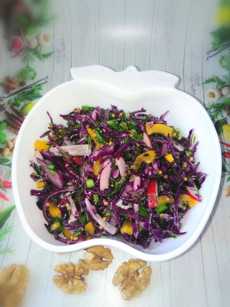 #академия Быстрый, вкусный и красивый салат на скорую руку . Ингредиенты: краснокочанной капусты, помидор, жёлтого перца, чеснока, зелень укропа и лука, дижонской горчицы, соли и сахара, ароматного подсолнечного масла Способ приготовления: Подготовить ингредиенты. Капусту тонко нашинковать, сложить в миску. Добавить соль и сахар и помять рукой до появления сока. Перец и редис порезать соломкой, зелень измельчить, чеснок выдавить через пресс. Добавить горчицу и масло. Перемешать. Приятного аппетита! Если вам понравился мой рецепт и вы приготовите по нему - мне будет очень приятно получить фотоотзыв!