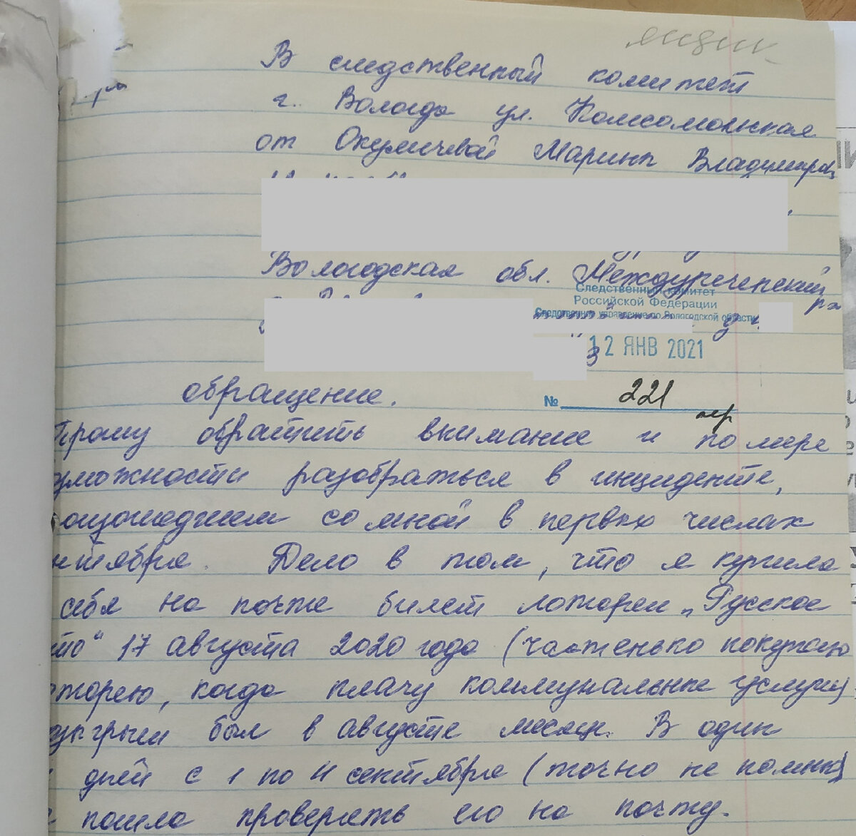 Часть вторая. Двойной КУСП. Итак, в Междуреченском отделе полиции поставили по сути барьер даже для элементарного обжалования, то Марина Владимировна изложила аналогичные обстоятельства и направила обращение в Следственный комитет по Вологодской области. Как обычный рядовой гражданин, она воспользовалась правом обращения через «ящик приема обращений», потому как личный прием ввиду известной болезни не проводился. Обращение датировано 15 декабря 2020 года. Штамп Следственного Комитета поставлен 12 января 2021 года. Значит, заявление лежало в ящике почти месяц. Только по изложенному обращению на неполных 7 тетрадных страницах полковник юстиции Е.В.Потехина ориентировала прокуратуру Вологодской области о факте мошенничества в отношении Марины Владимировны. А также напомнила областной прокуратуре об обязанности контролировать действия сотрудников полиции, что прямо предписано в ст.52 Закона «О полиции». Из областной прокуратуры в прокуратуру Междуреченского района обращение Марины Владим