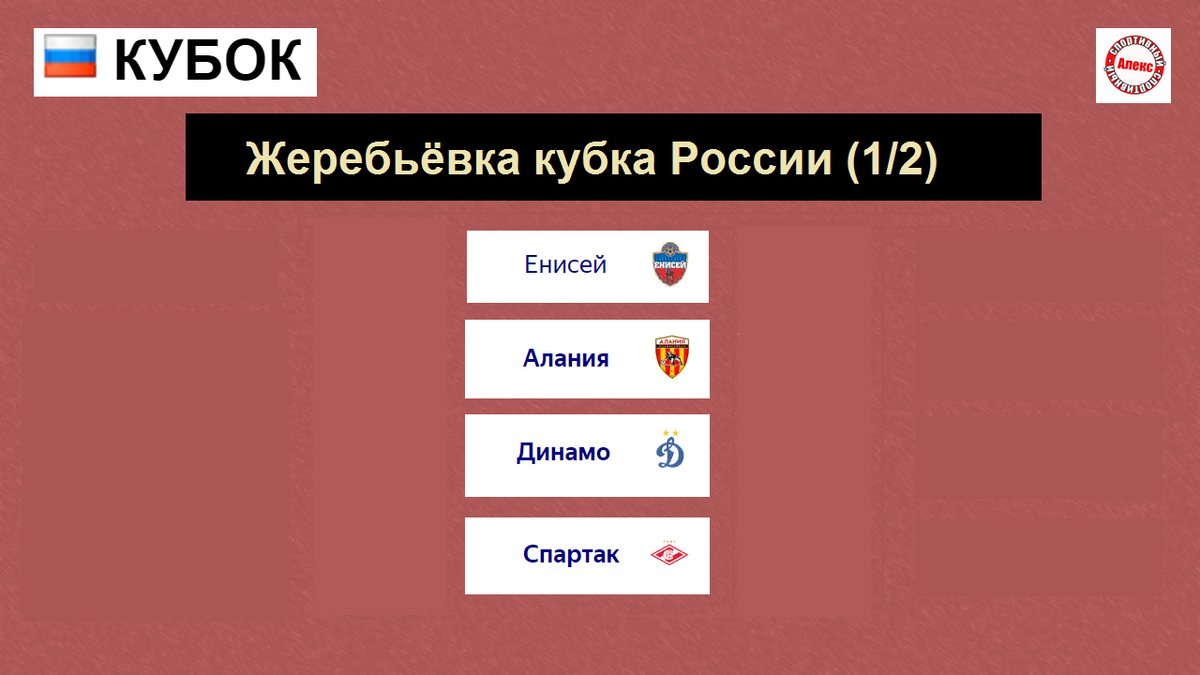 Приветствую на нашем канале. Состоялась жеребьёвка Кубка России по футболу. Как команды преодолели предыдущую стадию? Динамо переиграло Балтику лишь в серии пенальти. Енисей выбил участника премьер-лиги Рубин со счетом 3:1. Зенит в серии пенальти уступил Алании (5:6). Спартак с минимальным счетом обыграл ЦСКА. В полуфинале имеем две московские команды и две команды из второй лиги ФНЛ. Вспомним, что Динамо побеждало в кубке России один раз в 1995 году. высшее достижение владикавказской Алании – это выход в финал 2011 года. Енисей впервые в истории пробилась в полуфинал. Это их высшее достижение в турнире. Спартак – самый титулованный клуб (обладатель трёх кубков). В ходе жеребьёвки мы получили две пары. Сразу хочется вспомнить, когда команды встречались последний раз. в феврале текущего года была ничья в товарищеской игре 2:2. в 2020 году Енисей победил со счетом 1:0 в рамках кубка России. Игры пройдут 11 и 12 мая. Поставьте класс, если информация хоть капельку была полезной. Услышимся