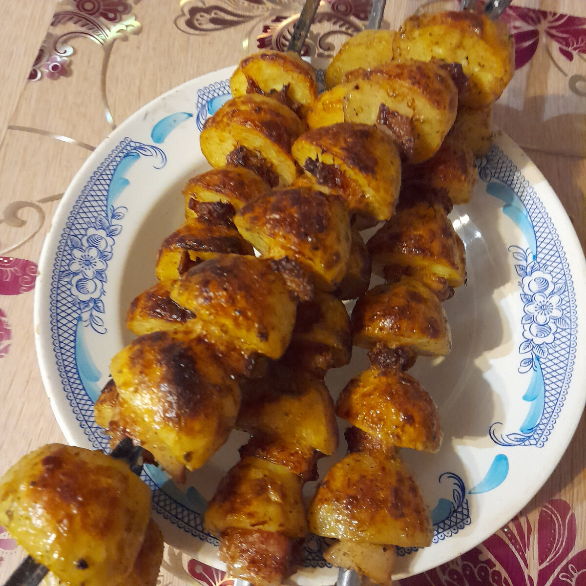 Доброго времени суток мои дорогие подписчики и гости канала. Сегодня вашему вниманию предоставляется рецепт «шашлыка» из картошки. Ингредиенты: Выбираем картошку среднего размера, нарезаем примерно по 2 см., чтобы прожарилась, сало 1,5 х 1,5 см. Кладем картофель в миску добавляем майонез, растительное масло, приправы, соль. Оставляем на пару часов. А еще лучше если вы маринуете мясо на шашлык на завтра, одновременно маринуйте и картофель. Вообще «бомба»!!! Насаживаем на шампур чередуя: картофель — сало, картофель — сало и т. д. Важно: в миске у вас останется смесь майонеза и масла. Можно, нет даже нужно, кисточкой периодически смазывать картофель. По готовности он станет золотисто — коричневый снаружи и мягкий внутри с божественным ароматом дымка. Еще одна «фишечка»: Если приобрести в магазине армянский хлеб «Матнакаш», насадить его на два шампура (чтобы не крутился на одном) и поджарить на мангале до хрустящей корочки (примерно по 3 мин. с каждой стороны), он зайдет от души!!! Многие