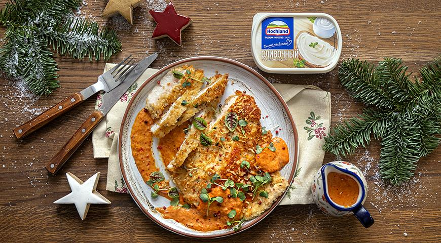 Отбивные из куриного филе в хрустящей панировке с соусом из сыра и двух видов печеного перца