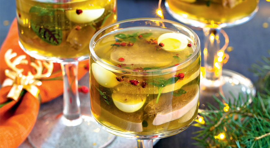 ИНГРЕДИЕНТЫ ПОШАГОВЫЙ РЕЦЕПТ ПРИГОТОВЛЕНИЯ Шаг 1 Положите язык и крылышки/шеи в широкую кастрюлю и залейте водой так, чтобы мясо было закрыто на 8–10 см. Доведите до кипения, убавьте огонь, посолите, добавьте сахар, снимите пену. Шаг 2 Добавьте разрезанные пополам лук и морковь, горчицу и перец горошком. Варите на слабом огне, не позволяя бурлить и подливая холодную воду, 8 ч. Шаг 3 Через 2 ч варки выньте язык и переложите в воду со льдом. Отрежьте подъязычное мясо (его лучше вернуть в бульон и варить еще 2 ч). Снимите с языка кожу. Заверните язык в пленку и положите в холодильник. Шаг 4 Готовый бульон процедите через сито, остудите, снимите жир. Взбейте слегка белки, смешайте с бульоном и взбейте венчиком все вместе. Поставьте на сильный огонь, доведите до кипения – белки шапкой поднимутся вверх. Снимите пену, аккуратно процедите бульон через полотенце – он должен стать прозрачным. Шаг 5 Нарежьте язык и подъязычное мясо небольшими кусочками. Перепелиные яйца нарежьте кружочками. Выло