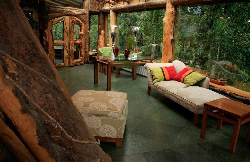 В республике Чили (Южная Америка), в городке Нельтуме, можно окунуться в сказку. В биологическом заповеднике Уило-Уило жизнь течет в своем естественном ритме. И в этом местечке неспешного бытия, в самом сердце патагонского леса дикая и прекрасная нетронутая природа открывает свои двери для гостей Montana Magica Lodge – необычного отеля. (Патагония – суровый дикий край с узкими реками и фьордами, с крутыми склонами и обрывистыми горами). Отель поразит воображение даже самых искушенных путешественников. Своим видом, прежде всего. Стоит представить себе огромный вулкан, одна сторона которого увита виноградной лозой, мхом и прочими видами местной растительности. А другая – это каменистый спуск. И вместо вулканической лавы сверху текут потоки воды. В тех местах она отличается удивительной чистотой. Окна этого чудо-отеля смотрят на прекрасный окружающий мир со всех его сторон. Однако, чтобы попасть в само здание, гость не должен опасаться высоты. К входу в вестибюль можно добрать