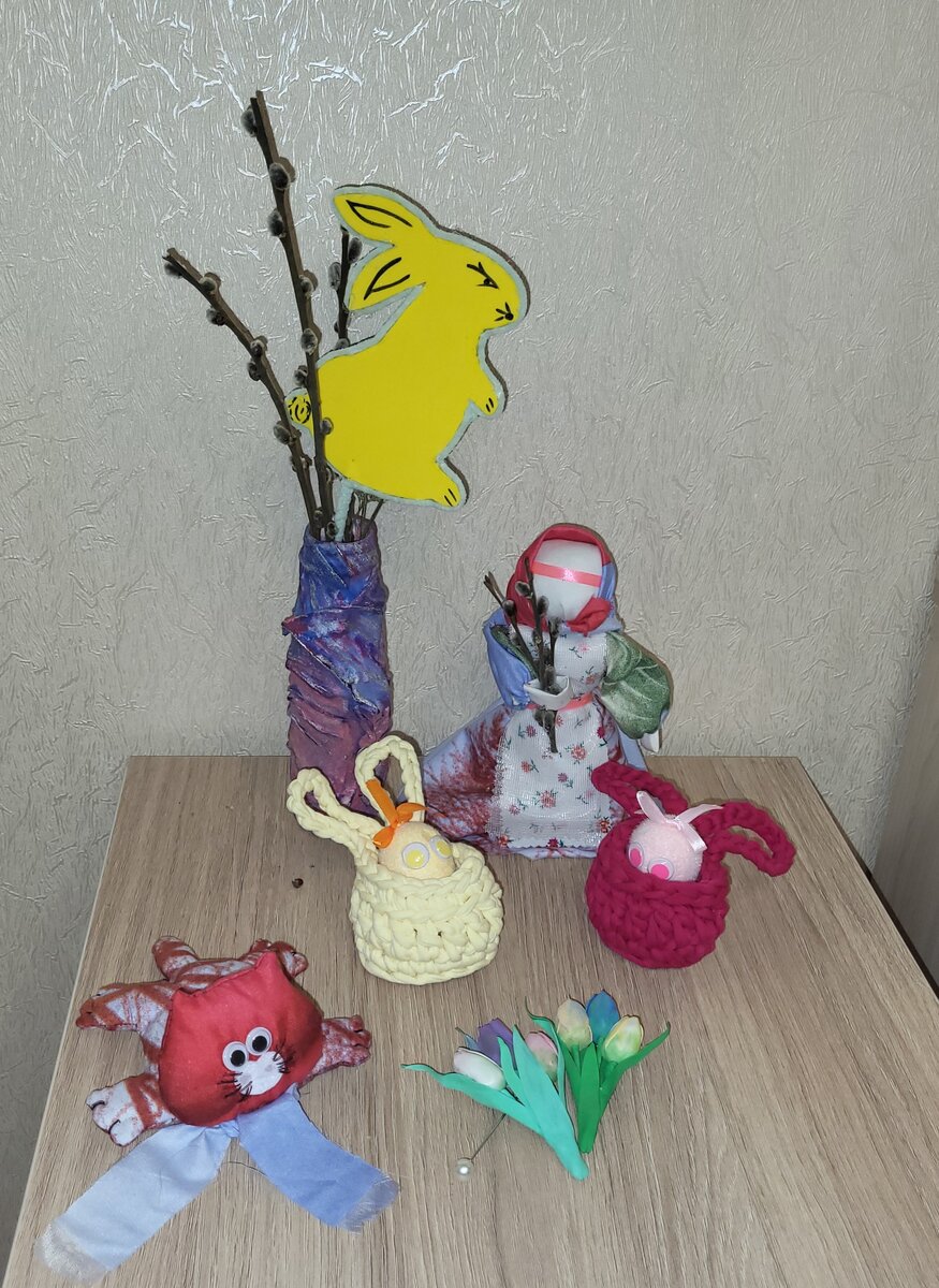 Все, что к Пасхе есть у меня! Не могу не поделиться своими изделиями к Пасхе! А изготовлены они на трудотерапии в Активном долголетии. Спасибо руководителю, Татьяне Александровне, и всем моим соратницам, которые вдохновляют и поддерживают. А ещё сами проводят свои мастер классы, делятся умениями. Низкий поклон вам, девочки. Кукла-вербница Светланин МК, корзиночки - Людмилин, тюльпанчики - автора статьи. Но об этом я уже поведала здесь в предыдущих статьях. Новый только заяц, его мы сделали под руководством Татьяны Александровны. А сегодня я собрала всех вместе в композицию, мне она показалась нарядной, интересной и праздничной! Чем и делюсь))) Всех с праздником! С Пасхой! Здоровья, благополучия и успехов в творчестве!!!