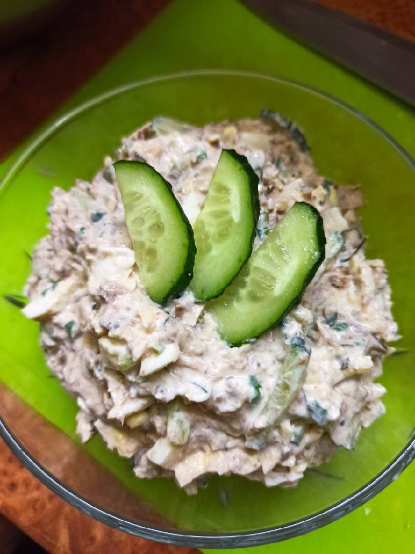 #быстро #просто #легко #вкусно #рыба #салат #тунец #закуска Ингредиенты: яйца, огурца свежих, тунца, сметаны, твёрдого сыра, Зелёный лук, укроп, петрушка Способ приготовления: Варёные яйца нарезаем кубикам или соломкой. Симпатичная подача, если выкладывать слоями. Я для себя не заморачивалась😁. Тунца выкладываем и размельчить вилкой. Отправляем в миску к яйцам. Нарезаем огурцы соломкой, туда же зелень (можно любую на свой вкус). У меня в морозилке всегда есть любая зелень, очень удобно. 😉 И последним натираем сыр, на крупную терку. Заправляем сметаной, перемешиваем и кушаем. Приятного Вам аппетита 😉😋