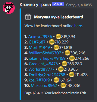 - Это соревнование. Команда !leaderboard (алиас !lb) показывает список самых богатых людей на сервере.