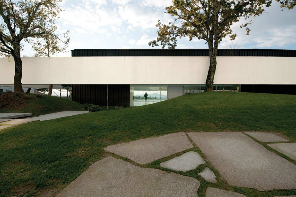 Этот современный двухэтажный дом построен на ровном открытом участке недалеко от Браги. По всему периметру он обёрнут белым кольцом-экраном, внутри которого планируется разбить дубовый сад. Наружная отделка вначале планировалась деревянная, но из-за предполагаемых проблем в обслуживании была заменена на оцинкованные патиновые панели...