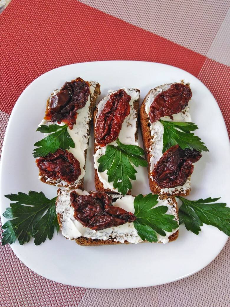 #академия Рецепт для любителей вкусных и быстрых в приготовлении бутербродов. Ингредиенты: хлеба, вяленых помидор, творожного сыра, зелени петрушки Способ приготовления: Приготовить все ингредиенты. На сухой горячей сковороде слегка поджарим хлебные ломтики (с одной стороны). Румяним две-три минуты при высокой температуре огня. На подсушенную сторону хлеба наносим творожный сыр. Добавляем вяленые помидоры: кусочками или крупными дольками (перед тем убираем масло салфеткой). Украшаем зеленью. Бутерброды с творожным сыром и вялеными помидорами готовы. Приятного аппетита!!!