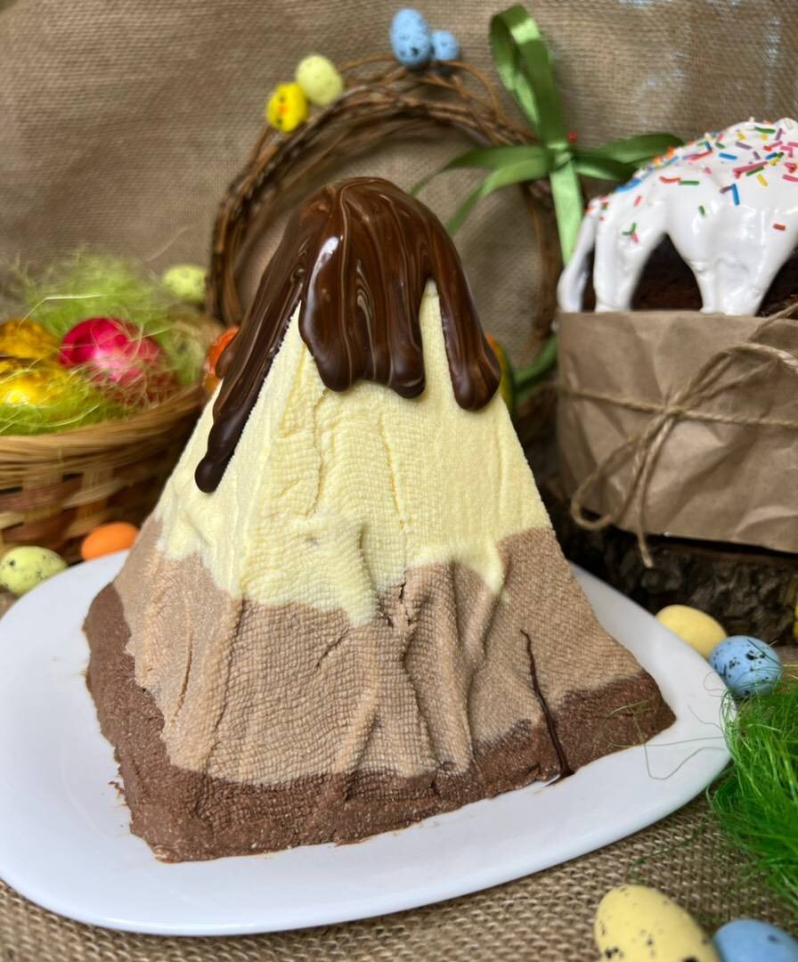 #лента Ингредиенты: гр Творог 9%, гр Сметана 20%, гр Сахар, гр Слив масло, Желтка (белки пошли на украшение кулича), Яйца, Ванилин, гр миндаля, плитка Белого шоколада, плитка Молочного шоколада, плитка молочного шоколада, плитка Горького шоколада, плитка горького шоколада Способ приготовления: Миндаль залить кипятком и оставить на 15 минут. Освободить от шелухи- после этой процедуры все отлично отходит! И затем подсушить на сухой сковороде. Порубить ножом. В творог добавить яйца, сметану, ванилин, сахар и тщательно пробить блендером. Поставить в толстостенной посуде массу на медленный огонь(можно на паровой бане, я делаю в мультиварке на режиме тушение-тут главное, не отвлекаться и постоянно помешивать!), добавить масло и довести до появления пузырьков. Можно снимать с огня- не путайтесь на данном этапе масс кажется очень Жидкое- это нормально). Пробиваем ещё раз блендером. Добавляем орехи, перемешиваем. Теперь нам надо разделить массу на три части. Так как пасхальная форма конусообраз