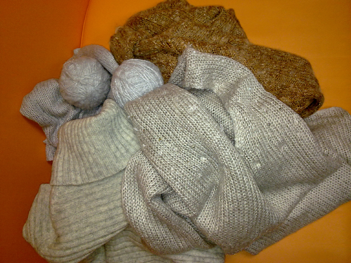 Я из тех людей, которые в меру своей "испорченности" пытаются делать из .....вна (сорри) конфетку. И это не из-за того что нет денег на приличный материал, а из-за того что мне очень нравится весь этот процесс, я бы сказала, превращения одного в другое))) Расскажу об одном сегодня... Моя коллега однажды проговорилась, что у нее есть несколько трикотажных кофт, которые ей стали малы (как это часто бывает) и которые жалко выбросить. Опппа-моя тема (подумала я). Приноси, говорю, носки свяжу, будет тебе память о твоей стройной фигуре))) Она обрадовалась и принесла. И начался процесс распускания... Друзья, как же мне повезло! Все вещи были связаны правильно!!!Это значит, что ниточка не обрывалась (за исключением тех мест где была протерта), а шла аккуратненько из стороны в сторону. То есть кофта как изделие была собрана из отдельно связанных полочки, спинки и двух рукавов. Но это бывает не всегда!!! Чаще большое вязанное полотно просто режут на детали, а потом сшив