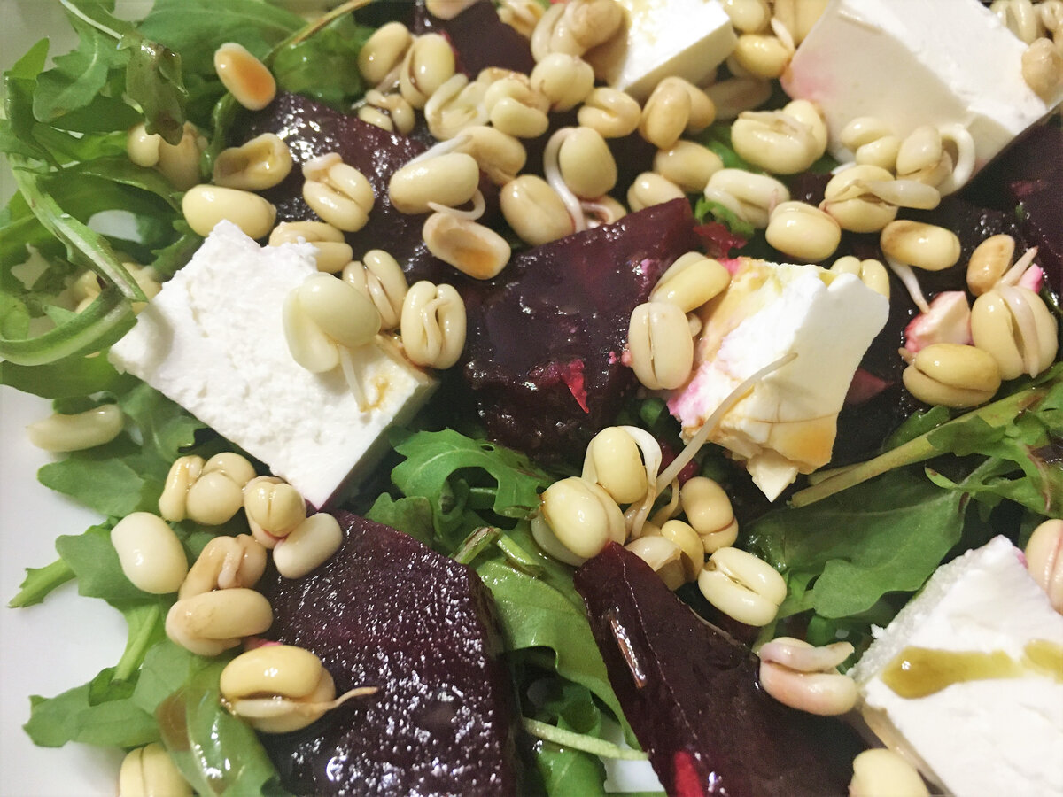 У меня сегодня - пророщенный маш. Как просто его прорастить в статье по ссылке. Свёклу для салата я запекла в духовке - насыщенней и полезней! Люблю салаты формировать слоями, не смешивая. А вы какие предпочитаете? Подложка у меня из рукколы, можно заменить салатом микс, салатом Айсберг, шпинатом. Свёклу нарезаю кусочками, чтобы удобно было зацепить вилкой. Сыр использовала Сиртаки, можно заменить любым рассольным сыром - брынзой, сулугуни или мягким сыром, либо использовать моцареллу - не будет солоноватости, которую можно добавить за счёт соевого соуса. Нарезать сыр кубиками и разложить между свёклой. Добавить пророщенный маш. Я заправила тыквенным маслом, можно заменить оливковым. Салат готов! Просто, быс