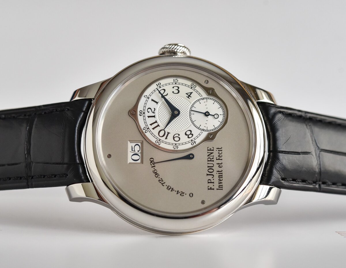 Циферблат новинки является главной её "жемчужиной" и особенностью. Выполненный в классическом и уже, пожалуй, фирменном стиле F. P. Journe, его поверхность изготовлена из белого или розового золота, а за основные функции здесь отвечает смещённый вправо комбинированный циферблат с отдельной малой секундой, ретроградный индикатор запаса хода слева, а также окошко большой даты чуть выше.