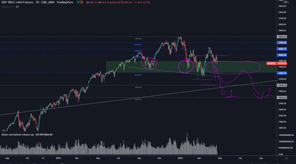 Давайте чуть повангуем. С фундаментальной точки зрения, в американской экономике огромные проблемы. Шо Опять? Ну давайте к фактам. Госдолг растет все новыми волнами, каждая больше предыдущей. Текущий долг почти 30000000000000, что составляет 130% от ввп. Если из ввп выкинуть фондовые деньги, стоимость лицензий, авторские права и прочую чушь абсолютно не отображающую состояние и мощь экономики, то долг составляет 450% от ввп. Кстати правительство США отказалось от публикации основных экономических данных, с чего бы это? Режим мягкого смягчения? Напечатали денег за последние 2 года, для решения последствий коронавируса столько же, сколько за последние 10 лет до того, то есть снежный ком упятерился. Инфляция на максимумах за последние полвека. В режиме санкций, компании будут терять прибыль и уже процесс пошел, недавний случай с отчетом netflix тому подтверждение. Ну это ладно, не углубляюсь, не моя тема. Мы смотрим на графики и пытаемся понять, что происходит, с целью предположить бу