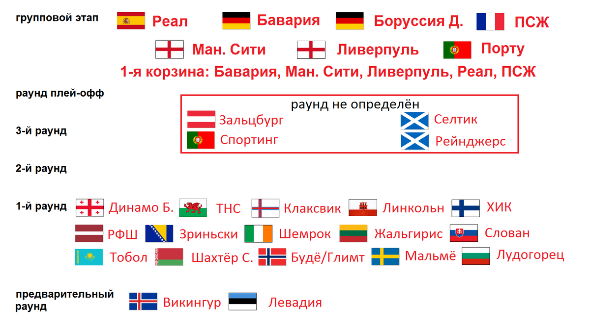 Эти 7 команд автоматически вышли в групповой этап, благодаря высокому месту своей страны в рейтинге УЕФА. 5 из них, скорее всего, попадут в первую корзину посева (Бавария, Ман. Сити, Ливерпуль, Реал, ПСЖ).
