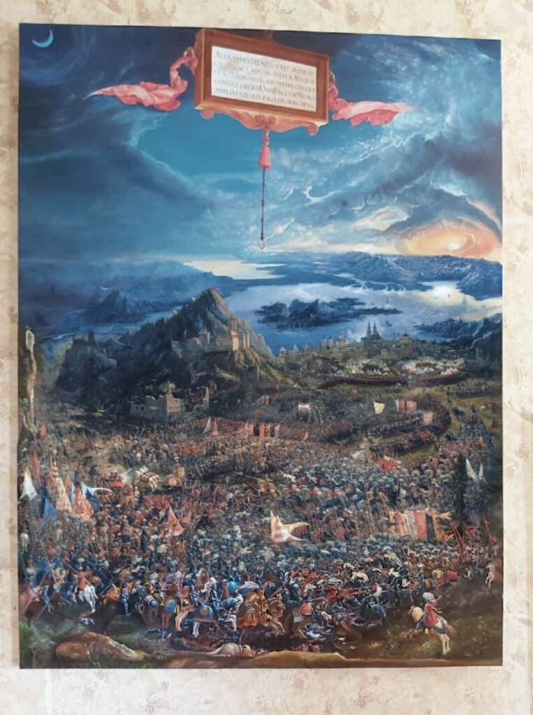 Добрый день! Перед Вами копия картины немецкого художника Альбрехта Альтдорфера. Также известна под названием " Битва при Иссе". Картина находится в Старой пинакотеке (Мюнхен, Германия). Я хотела бы немного рассказать о картине: Картина создавалась в 1528—1529 гг. по заказу герцога Баварии Вильгельма IV. На полотне изображено сражение между македонской армией Александра Великого и персидским войском царя Дария. Художник изобразил сражающихся в современных его эпохе доспехах. На переднем плане сошлись македоняне и персы. Македонян можно узнать по бело-голубым доспехам. Персы сражаются в красном облачении, на некоторых из них надеты тюрбаны. Особенностью картины является ландшафт с заходящим солнцем и восходящей луной. В центральной части картины мы видим колесницу Дария, преследуемую Александром. В левой части картины возвышается гора с замком. На заднем плане представлена восточная часть Cредиземного моря с островом Кипр, за ним Красное Море, правее Альтдорфер изобразил Египет с дел