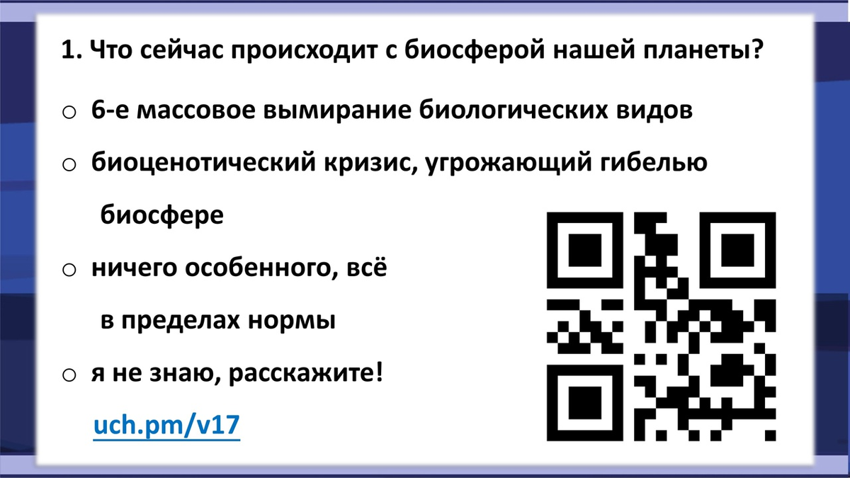 Друзья, ещё раз ответьте, что сейчас происходит с биосферой нашей планеты. Ещё раз проголосуйте, перейдя по ссылке в чате. А мы пока продолжаем отвечать на вопросы зрителей.