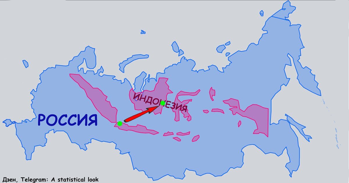 1. Спасибо Герарду Меркатору, Россия выглядит на карте значительно внушительнее, чем на глобусе. По этой же причине мы в России зачастую недооцениваем размер и значение южных тропических стран. На меркаторовой карте расположенная на экваторе островная Индонезия настолько мала, что раз пять или десять свободно умещается внутри России (с сохранением проливов между островами). Но, как показано на заглавной картинке, в действительности Индонезия настолько велика, что её протяжённость с запада на восток сравнима с расстоянием от Петербурга до Охотского моря.