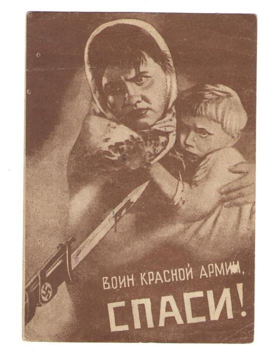 Почтовая карточка "Воин Красной Армии, СПАСИ!", отпечатана в 6-ой типографии ОГИЗ'а на 1-ом Самотечном переулке, Москва, 1943 год. Репродукция с агитационного плаката Виктора Борисовича Корецкого. На лицевой стороне открытки, изображены мать с сыном, на которых направлен окровавленный штык винтовки фашистского солдата. Представленная почтовая карточка - это письмо отца с фронта своей дочери Полевой Людмиле Ивановне, написанное 20 января 1943 года и отправленное в город Куйбышев. "Здравствуй милочка моя дорогая, шлю привет дочка, сам здоров, давно уже нахожусь там, где рвем блокаду вокруг г. Ленина наверно от тебя много поступило мне писем, приеду тогда сразу на все отвечу, пиши не переставая в ... ... ты теперь читала результаты нашего фронта, крепко тебя целую, будь здорова и счастлива, до свиданье твой папа" Открытки 41-43 годов это прежде всего очень настойчивые призывы к красноармейцам решительнее защищать свою Родину. Авторы открыток мотивируют бойцов самым святым, тем, против чег