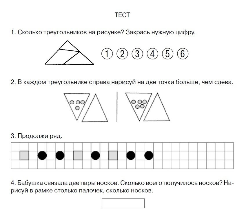 Он поможет понять, развито ли у ребенка мышление или он опирается только на память. Разбор теста смотрите сразу после заданий. Анализируем результаты теста. Обратите особое внимание на задание 1 и 5. Даже если ребенок дает в задании 1 правильный ответ (3), попросите его показать эти треугольники. Он может считать треугольником четырехугольную фигуру, похожую на ромб, а "охватывающего" треугольника не видеть. Это говорит о слабом развитии пространственного мышления. У этого ребенка в школе наверняка будут проблемы с решением задач и с вычислениями в уме, поскольку эти виды деятельности "держатся" на умении хорошо все себе представлять в уме. Если ребенок не справился с заданием 5, то у него проблема со зрительно-моторной координацией, и у него будет плохо с обучением письму. И чаще всего эта проблема сопровождается плохим развитием мышц кисти. Начертите на листе бумаги по трафарету или циркулем кружок, и дайте его ребенку вырезать по контуру. Только ножницы должны быть хорошие: должны н