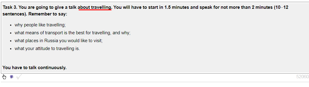 Если вы свободно владеете английским, этот пункт к вам не относится. Но если вы не так уверены в себе — говорите максимально просто! Лексику по теме вы и так употребите, необходимый минимум заложен в самих опорных пунктах. Но чем сложнее ваши мысли и ваши предложения, тем больше шансов наляпать ошибок. Никакого бонуса за сложность нет! Простое высказывание, если оно соответствует всем критериям, будет оценено точно так же, как и сложное, зато вы не запутаетесь.