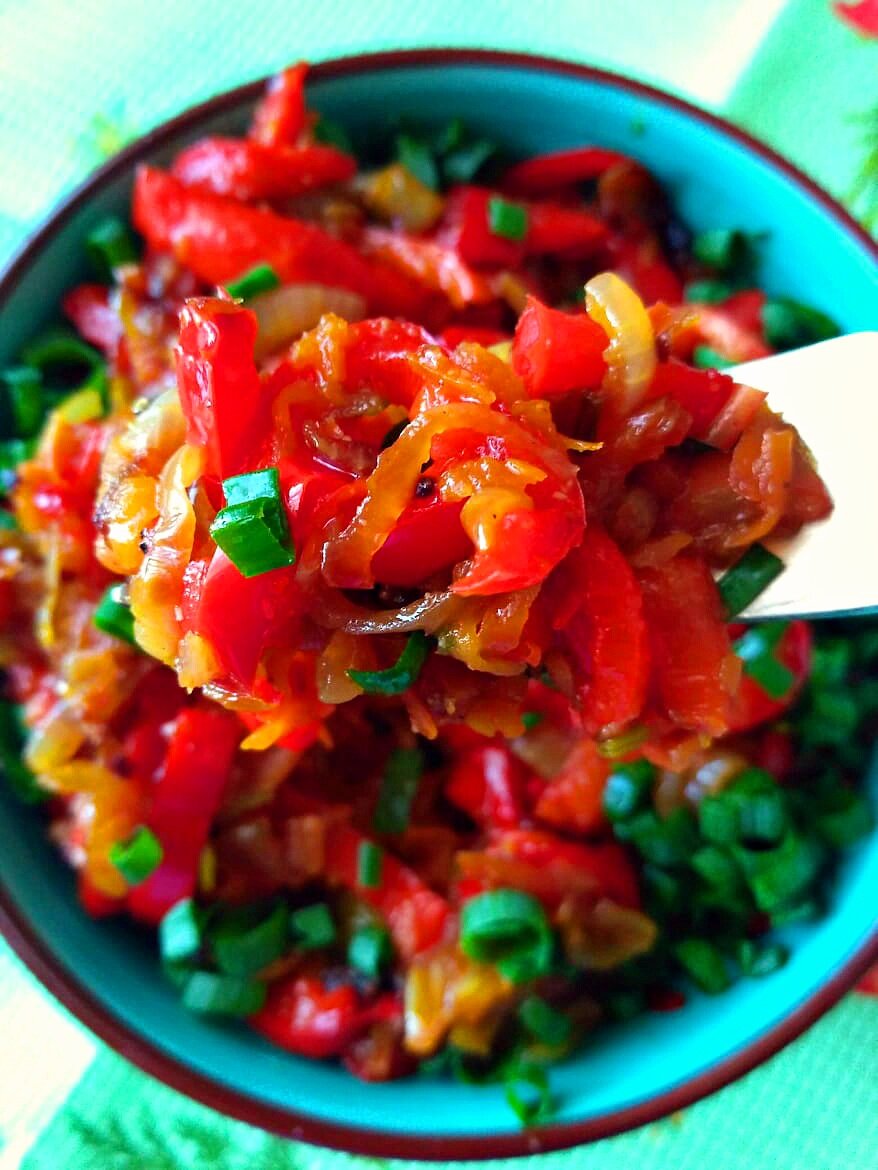 Жареный перец. Простая, ароматная и вкусная закуска, типичная для Крыма и нашего городка) Тарелка такой закуски всегда есть у меня на столе. Вкусная она и в горячем и в холодном виде. Отрезаешь кусочек батона, сверху закуску из перца, ломтик холодной курятины, веточку зелени - красота. Стакан холодного компота, и прекрасно) Готовится легко, по материальным затратам - копейки. Вкус и аромат юга на вашей кухне. Две морковки и две луковицы, среднего размера, 700 гр сладкого перца, лучше красного. Овощи вымыть и почистить. Теперь готовим, методом последовательной закладки. Ставим разогревать сковороду, с растительным маслом, в это время натереть на тёрке морковь. Масло разогрелось, обжариваем морковь, на среднем огне. Нарезаем лук, скибочками - четвертинками, добавляем к моркови, помешивая, обжариваем. Нарезаем соломкой перец, добавляем в сковороду и продолжаем обжаривать. Соль, перец, больше ничего не нужно. За три минуты до готовности - немного чеснока, через пресс, зелень. #овощная