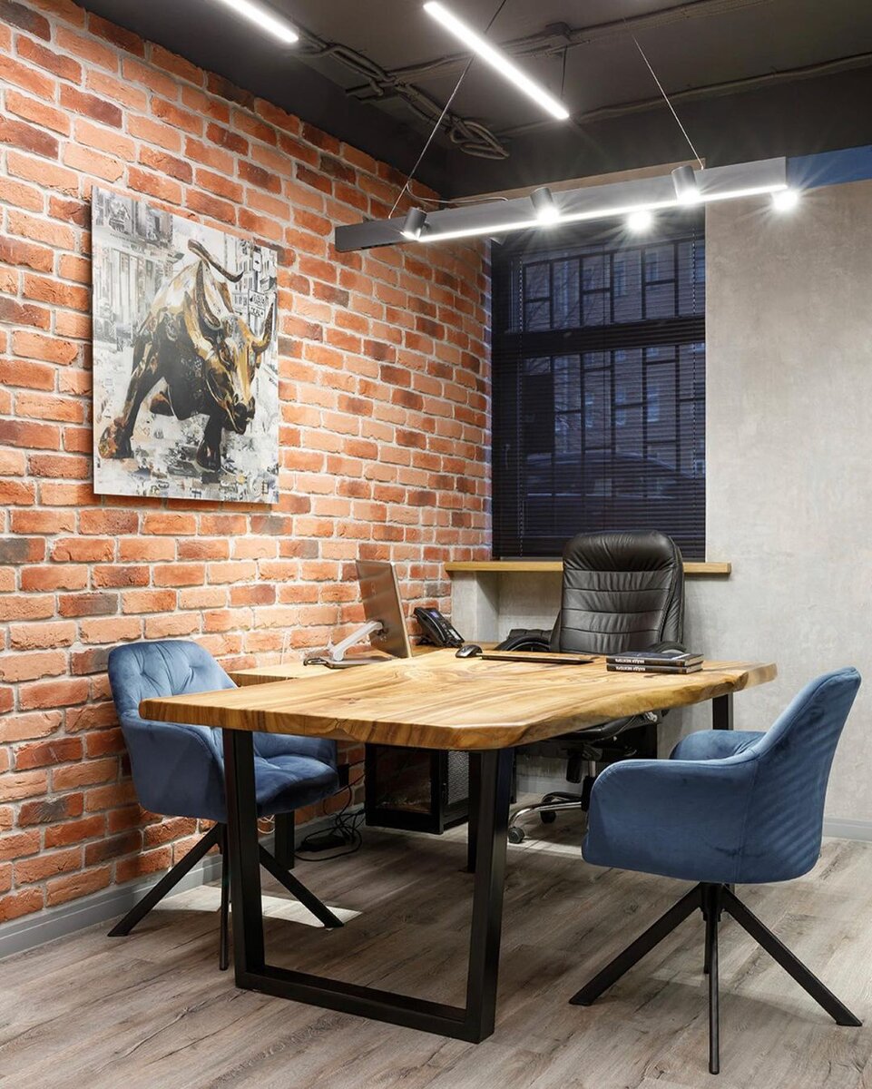 Для отделки стен здесь использовался кирпич, стены декорированы под бетон с помощью декоративной штукатурки, сочетание дерева с металлом, полоса синего цвета, которая идет вдоль стены, как в промышленных зонах.