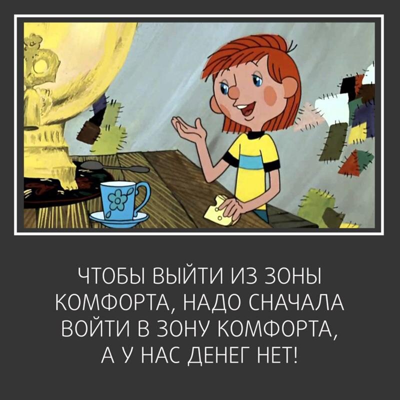 Мы часто (постоянно!) слышим «Выйди из зоны комфорта!» Слышим это от коучей по «успешному успеху» и от акул бизнеса. От друзей, родителей. Фраза «Выйди из зоны комфорта!» стала настоящим лозунгом поколения Z. Но что чаще всего можно услышать в ответ? «Какой комфорт? Денег нет, начальник - редиска, муж/жена пилит, дети не слушаются, три кредита, ипотека, ещё и машина сломалась, и отпуск на ноябрь перенесли!» В общем, чтобы выйти из зоны комфорта, нужно сначала войти в зону комфорта, а у нас денег нет.