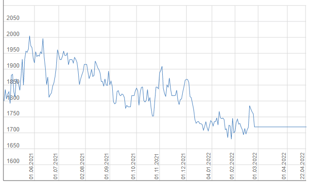 На Украине есть фондовая биржа на которой торгуются 49 американских, 34 украинские и 15 европейских акций. Индекс фондового рынка Украины (UX) выглядит так: С 25 Февраля 2022 года украинского фондового рынка не стало. Обзор закончен. Точка. У.