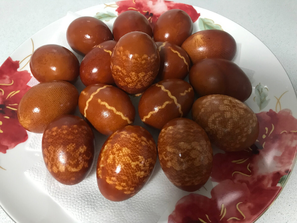У каждой хозяйки есть свой заветный способ красить пасхальные яйца. Я пробовала разные, в том числе и новомодные рецепты, однако, убедилась, что самый лучший способ - «дедовский», с луковой шелухой. Да и яички получаются вкуснее. Вчера приятельница пожаловалась; она пыталась покрасить пасхальный продукт куркумой. Потратила последний пакет отличной индийской куркумы, но результат её разочаровал. «Пришлось перекрашивать лучковой шелухой!» - печалилась она. Так что у меня не было сомнений, чем красить. Но я решила поэкспериментировать с рисунком. В рукодельной шкатулке нашлись старые кружева и тонкая тесёмка. Вот ими я обшивала вымытые яйца. Главное, как можно плотнее прижать ткань к скорлупе, конечно, не раздавив её. Кружева эластичные, с ними особых хлопот не возникло. А вот тесьма оказалась капризной, с ней пришлось повозиться. Особенно трудно из неё сделать крест на яйце. Приноровилась так: первая полоска сшивается по ширине яйца, тут же прихватывается кончик второй полоски - по
