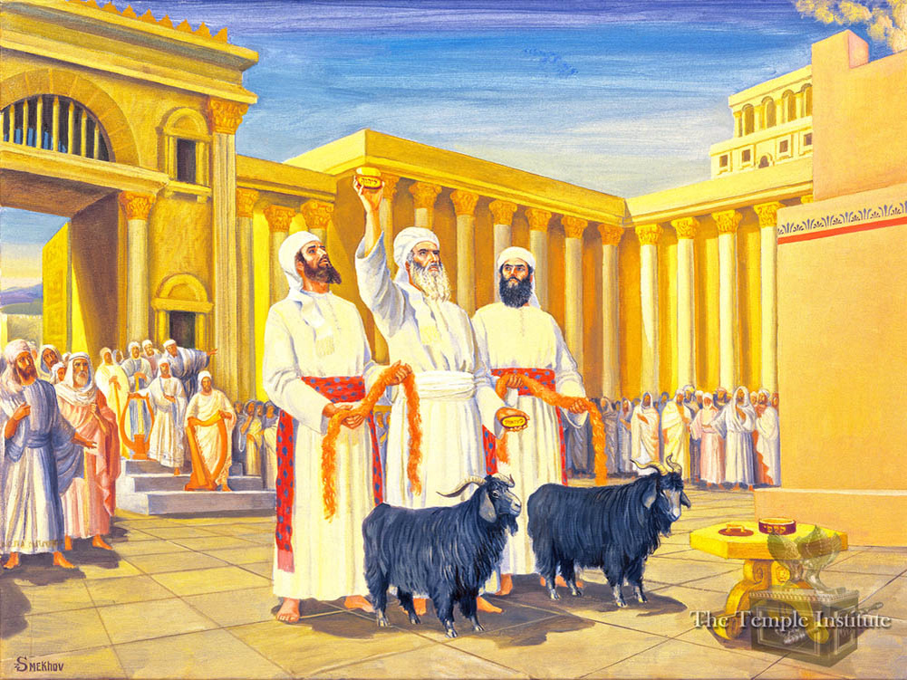 «И принесёт Аарон тельца в жертву за грех за себя и очистит себя и дом свой. И возьмёт двух козлов и поставит их пред лицом Господним у входа скинии собрания; и бросит Аарон об обоих козлах жребии: один жребий для Господа, а другой жребий для отпущения. И приведёт Аарон козла, на которого вышел жребий для Господа, и принесёт его в жертву за грех, а козла, на которого вышел жребий для отпущения, поставит живого пред Господом, чтобы совершить над ним очищение и отослать его в пустыню для отпущения» (Лев. 16:6–10).