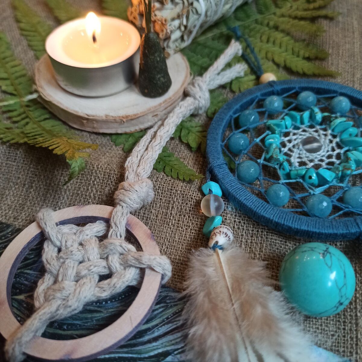 Состав набора 🌊Магия Воды🌊 🌊💙💦 1. Ловец снов Стихии Воды. Ловец имеет форму перевернутой капли, как будто стекающей вниз. Символика: внешний круг из голубого тонированного кварца: это символ общения и способности ясно выражать свои эмоции и чувства. Средний круг из бусин говлита, минерала, который может становиться разным, в зависимости от задумки мастера, с ним работающего. Так же, в разные моменты времени могут быть различными наши эмоции и чувства. В центре бусина переливающегося тонированного кварца, такого, символ ясности и многогранности нашего внутреннего Я. На спиле сосны нарисован символ стихии Воды. Диаметр 8 см, длина 23 см (без петли) 🌊💙💦 2. Узел Жива. Он помогает сохранить молодость и здоровье, успокаивает и придает сил. Этим узлом можно заряжать воду. 🌊💙💦 3. "Ведьмина свеча" из синей вощины с медуницей и тысячелистником. Медуница - первый весенний цветок, появляющийся как только сходят весенние воды и готовый напоить пчёл своим нектаром. Тысячелистник - ун