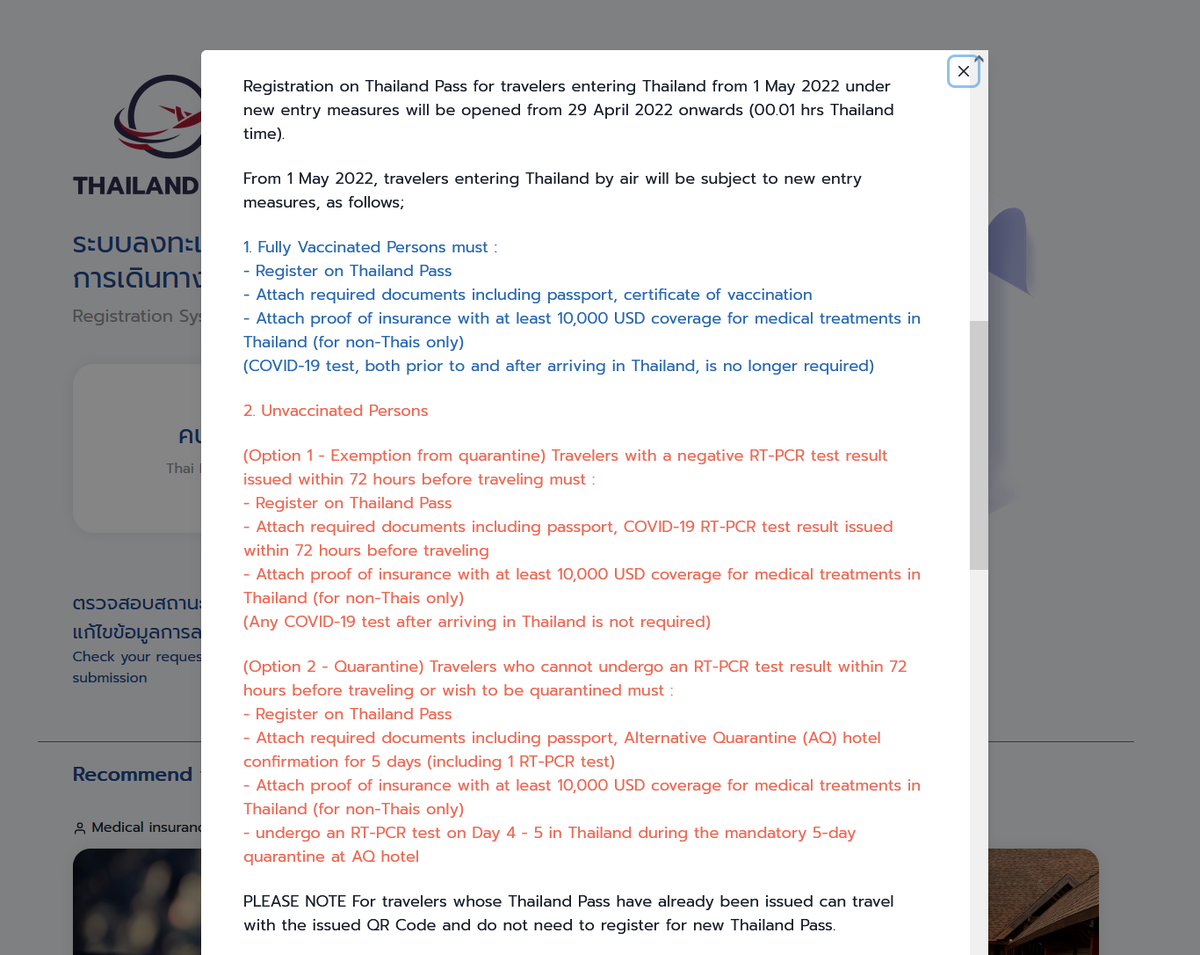 Регистрация на ThaiPass для путешественников, въезжающих в Таиланд с 1 мая 2022 года будет открыта с 29 апреля 2022 года (00:01 по таиландскому времени).