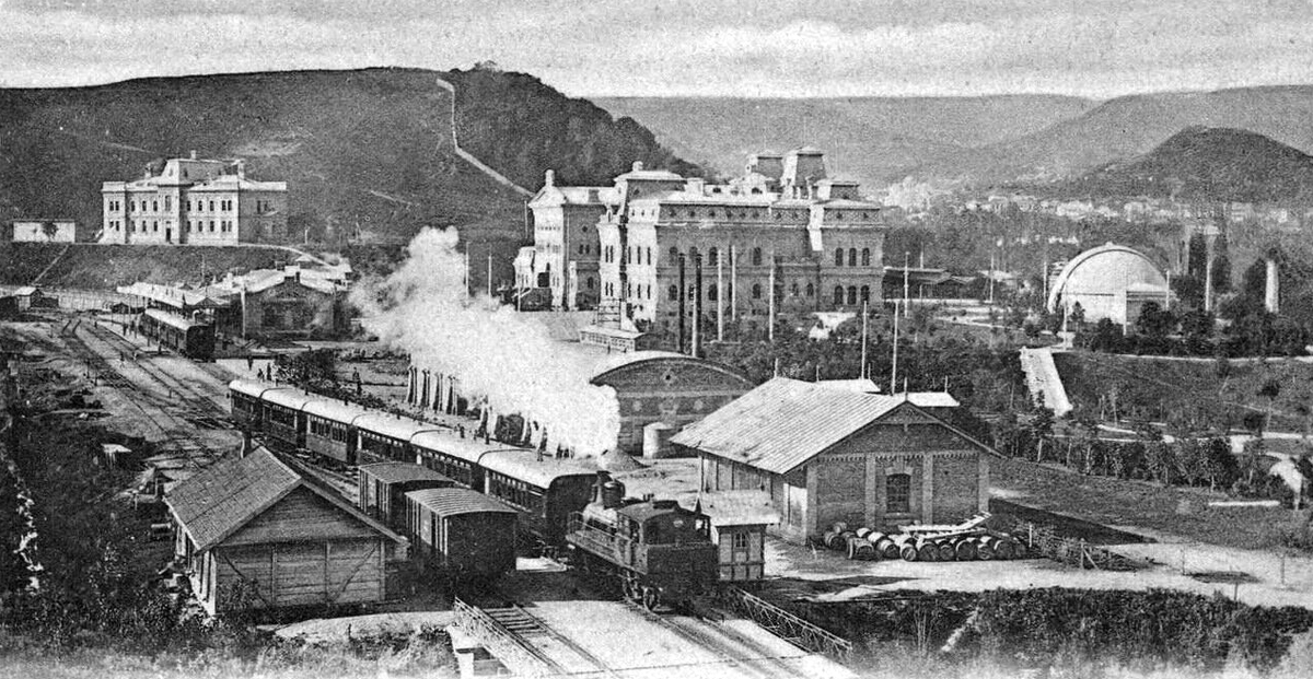 В конце XIX века в город пришла железная дорога. Регулярное движение пассажирских поездов от Кисловодска до минеральных вод было организовано в 1894 году. Это была отдельно построенная линия протяженностью в 60 верст, соединившая курорт с остальными городами России. На станции возвели одноэтажное кирпичное здание вокзала 3 класса и прочие служебные постройки. В зимнее время вокзал отапливался печами. В нем также было предусмотрено большое помещение для почтового ведомства. Перед вокзалом находилась низкая платформа с длинным навесом. Проект обошелся Владикавказской железной дороги в 3 000 000 руб.