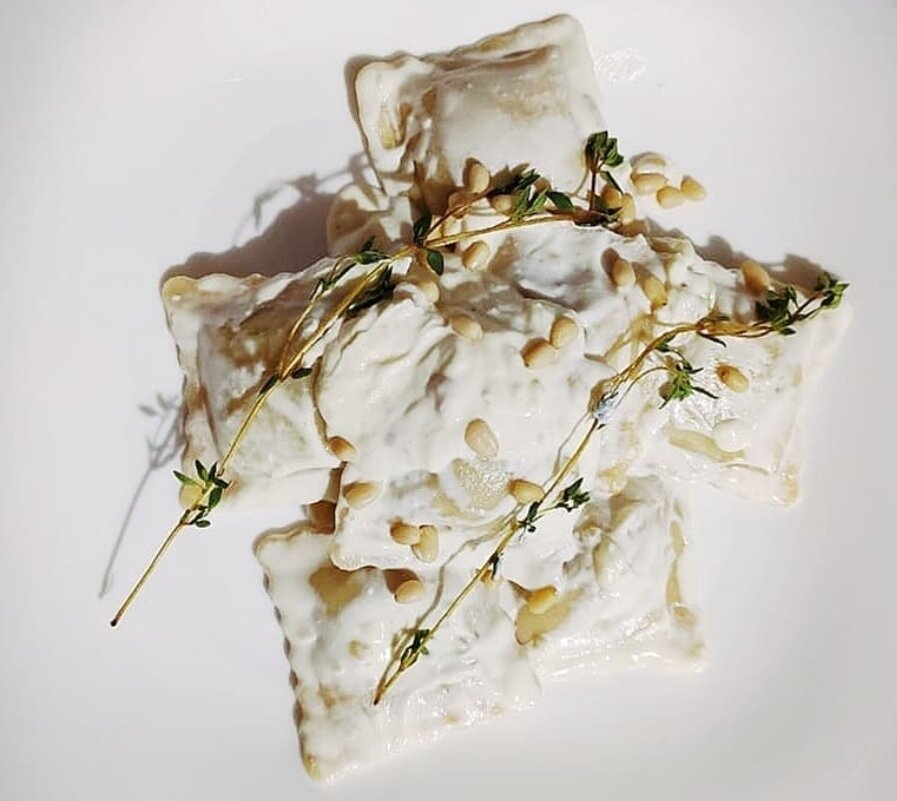 Для соуса необходимо слегка растолочь в ступке очищенные кедровые орешки, добавить сливки и веточку тимьяна - подогреть соус на сковородке. Опустить в соус сваренные равиоли, тушим пару минут. Подаём с белым итальянским вином.