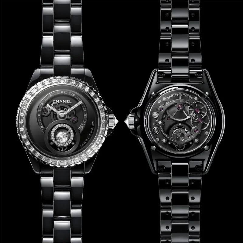 В Женеве ювелирный и часовой Дом Chanel представил грандиозную новинку — модель J12 Diamond Tourbillon, оснащенную первым в истории бренда турбийоном, созданным непосредственно силами Chanel. Компания заявляет, что авторами новинки выступил Арно Шастен — директор Chanel Watchmaking Creation Studio — и другие сотрудники мануфактуры в Ла-Шо-де-Фон в Швейцарии. Скорее всего, в разработке механизма Caliber 5 также участвовал часовой мастер Роман Готье, который создавал компоненты для многих калибров Chanel. Часы имеют ручной подзавод. Первый в истории Chanel парящий турбийон украшен внушительным бриллиантом, который сопровождают 34 драгоценных камня огранки багет на безеле. Заводная коронка из белого золота также украшена бриллиантом классической огранки. 38-миллиметровый корпус J12 Diamond Tourbillon выполнен из черной керамики и белого золота. Коллекция лимитирована 55 экземплярами.