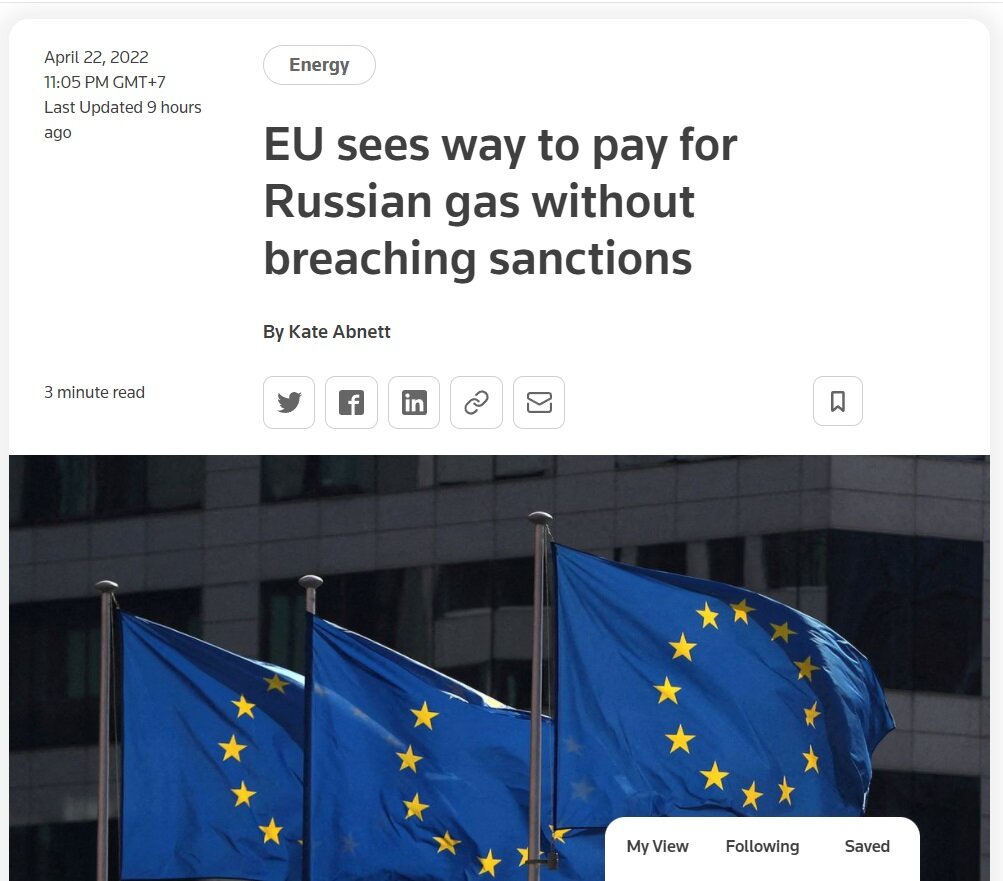 БРЮССЕЛЬ, 22 апреля (Reuters) - Компании ЕС могут обойти требование России получать платежи за газ в рублях без нарушения санкций, если они платят в евро или долларах, которые затем конвертируются в российскую валюту, заявила Еврокомиссия в пятницу. Письмо с разъяснениями странам ЕС разослала Европейская комиссия. Агентство уточняет, что, согласно новым требованиям России, по существующим контрактам все еще возможно вносить оплату в долларах или евро. "Компании ЕС могут попросить своих российских коллег выполнить свои контрактные обязательства таким же образом, как и до принятия указа, то есть внести причитающуюся сумму в евро или долларах", - говорится в документе. Европа начинает трезветь.