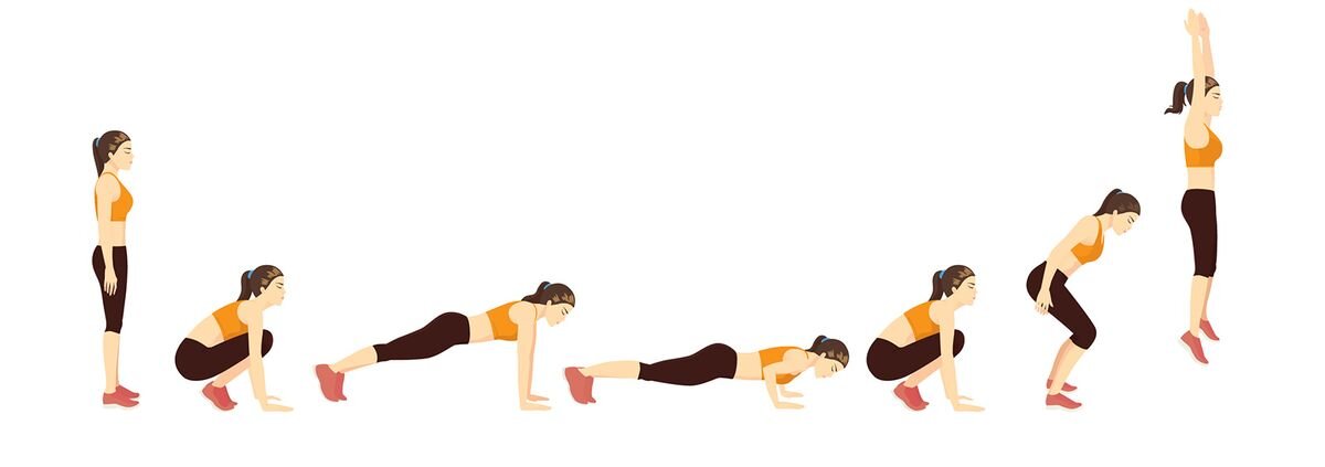 Мегаэффективное упражнение, которое включает в себя сразу три элемента: планку, отжимание и прыжок. При его правильном выполнении вы будете одновременно тренировать мышцы плеч, ног, рук, груди, пресса, спины и ягодиц.