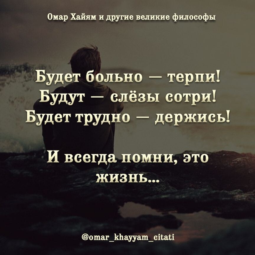 «Будет больно – терпи!» Хотя зачем терпеть, если больно. Почему нужно терпеть? Говорите, кричите об этом, обращайтесь за помощью к другим и себе. «Будут слезы - сотри». Зачем? Если хочется плакать, плачьте! Иначе ваши невыплаканные слезы так и останутся внутри вас и будут разъедать изнутри. «Будет трудно – держись!» Зачем совершать подвиг? Чтобы пожалеть себя: "какая я бедная и несчастная" или погладить по головке: "какая я молодец, все могу выдержать". Если трудно, подумайте, почему трудно, как вы к этому пришли, какую ошибку совершили, что надо сделать, чтобы стало легко. «И всегда помни, это жизнь…» Мы выбираем ту жизнь, которая согласуется с нашими внутренними принципами и установками. Если ваша установка «Жизнь - это страдание, а мне остается только терпеть» , то значит это ваш выбор. Если же внутри вас установка: "Моя жизнь в моих руках", то все проблемы на вашем пути вы будете воспринимать, как нечто временное. Вы не будете смотреть на них как на огромную тяжесть, котору
