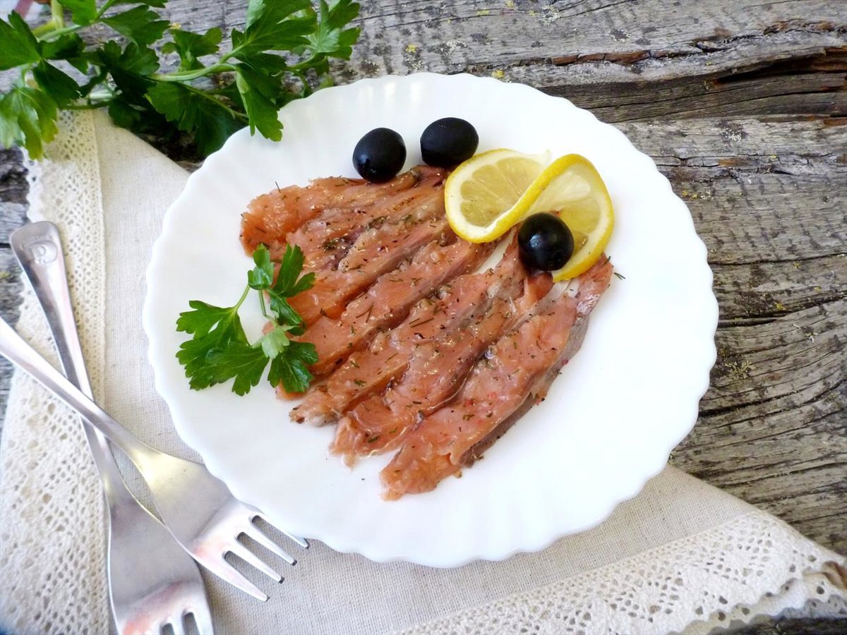 Вкусно посолить горбушу можно и в домашних условиях. Нужны только свежая рыба, соль, сахар и укроп. Бутерброды с соленой рыбой отличная закуска на праздничном столе. Ккал: 136.11, время приготовления: 1080-1200 мин., порций: 3 #Салаты и закуски #Русская #Блюда из рыбы #Закуска #Праздничное блюдо Ингредиенты Приготовление: 1. Свежую горбушу почистить от чешуи, выпотрошить, помыть. Отрезать кусок, который хотите посолить. Для засола 1 килограмма горбуши берут 2 ст.л. соли и 1 ст.л. сахара. Если хотите, чтобы рыба была малосольная, то 1 ст.л. соли. Поэтому рассчитывайте правильно пропорции соли и сахара на взятый вес рыбы. В любом случае солёность рыбы - это дело вкуса! 2. Перемешать ингредиенты посолочной смеси (соль, сахар и сухой укроп). Равномерно посыпать куски рыбы. При желании можно добавить черный перец. 3. Сложить куски рыбы мясом внутрь. 4. Положить рыбу в удобную емкость и придавить грузом. 5. Поставить для просолки в холодильник на сутки. За это время перевернуть рыбу на