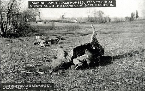 Что общего между взятием Трои и укрытием для французских снайперов Первой мировой войны? Да — конь. Подобную конструкцию, изготовленную из папье–маше, французы придумали устанавливать на линии фронта в местах с равнинным ландшафтом. С виду лошадь, как лошадь, но если заглянуть с другой стороны, то внутри она полая и даже с телефоном. Солдат вынужден был находиться в своём укрытии в течение всего дня, передавая информацию о передвижениях противника, и незаметно отстреливать неприятеля. Как утверждают здесь, стрельба велась через естественное, предусмотренное природой, отверстие в теле "животного".