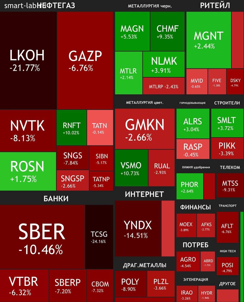 🇷🇺 Рынок завершил неделю на минорной ноте, потеряв 8% по Индексу Мосбиржи и зайдя в зону февральских продаж. Если пройдем 2200 пунктов, следующей остановкой станет только 1800 п. Даже без заблокированных нерезидентов, негатив на рынке возрастает, впитывая в себя все фундаментальные риски. ЦБ весь март делал все возможное, чтобы отбить желание валютных инвесторов покупать доллар. Даже после снятия ограничений на покупку валюты, быки не спешат возвращаться к покупкам. Многие аналитики считают, что рубль чрезмерно укрепляется и ждут девальвацию национальной валюты, как и я, впрочем. 🛢Нефтегазовый сектор остается под давлением. Дисконт цены на нефть марки Brent и нашей Urals достигает исторических значений. О причинах мы поговорим в отдельной статье в понедельник, а пока Газпромнефть теряет 5,2%, Татнефть 5,3%. Роснефть переориентирует экспорт на Восток и выглядит лучше рынка, +1,8%. Лукойл в числе аутсайдеров. Теряет за неделю 21,8% капитализации и президента. Это были отличные 29 ле