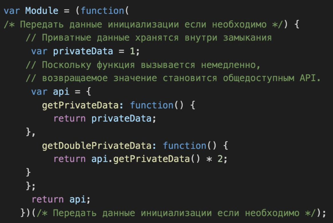 Паттерн Модуль — это шаблон проектирования, который предоставляет способ инкапсуляции частных членов при создании общедоступного API. Это достигается путем создания IIFE, который позволяет нам определять переменные, доступные только в его области (через замыкание). Одновременно с этим возвращается объект, содержащий общедоступный API. Ниже мы можем увидеть более полный пример модуля, определенного с использованием литеральной записи объекта: Глядя на другой пример, мы видим корзину для покупок, реализованную с использованием этого шаблона. Сам модуль полностью автономен глобальной переменной с именем BasketModule. Массив корзины в модуле хранится закрытым, поэтому другие части нашего приложения не могут его напрямую прочитать. Он существует только при закрытии модуля, поэтому единственные методы, которые могут получить к нему доступ, — это те, у которых есть доступ к его области видимости (т. е. addItem(), getItem() и т. д.). #практика #javascript