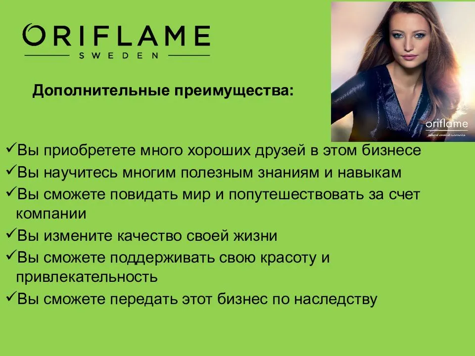 При регистрации вы получите: Бесплатное обучение и тренинги для новичков Общение в кругу единомышленников и поддержка онлайн Бонусы, акции и скидки до 90% только для участников Зачем это именно тебе и именно сегодня? 1 Орифлейм – прекрасная возможность для партнёров экономить на покупке косметики от 20 % до 90% 2 Получать дополнительный заработок, когда другие испытывают трудности. 3 Строить карьеру в международной компании, которая официально отказалась уходить с российского рынка. 4 Начать собственный бизнес без вложений или с минимальными вложениями даже по российским меркам. Преимущества зарегистрированных партнёров Орифлейм Гарантия качества Ты получаешь продукцию непосредственно от компании Только для зарегистрированных партнёров Скидки от 20% до 90% А также гарантированные подарки и бонусы Возможность при