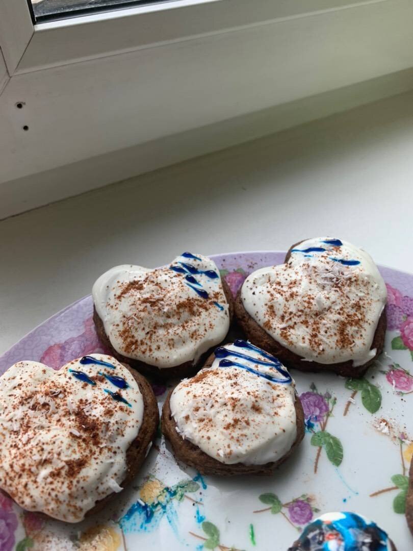 Ингредиенты: масло сливочное, яйцо, мед, кипяток, сахзам, сода, мука цз, какао, сметана и сахзам (для украшения) Способ приготовления: Смешать яйцо с маслом и медом, добавить кипяток, хорошо перемешать. Добавить соду, какао и сахзам, просеять муку. Замешать тесто, обвернуть в пищевую пленку и отправить в холодильник на 30-40 минут. Достать из холодильника и сформировать фигурки из теста. Поставить в духовку на 10-15 минут при 180. Достать из духовки и украсить сметаной + сахзам, корица, кокосовая стружка и тд.