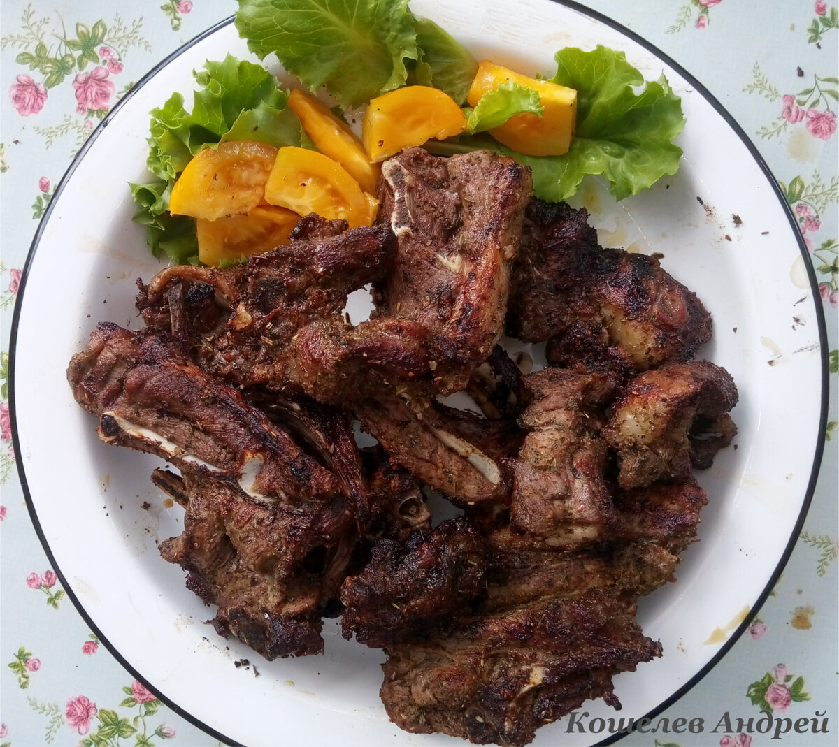 5. Пришло время разводить огонь и подготавливать угли) Смазываем решетку растительным маслом (с помощью ватного диска) и укладываем на нее ребрышки. Обжариваем с каждой стороны по 4-5 минут, наша задача, что бы прожарилось, но не высушилось) хотя, если баранину снять раньше, чем положено, она будет жесткая или как бы резиновая. 6. Все, подаем к столу. Идеа