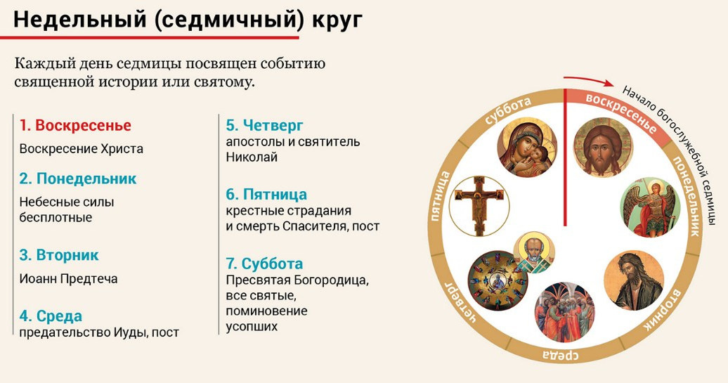 Каждый день на церковном богослужении вспоминаются следующие события Воскресные дни - события Воскресения Христова Понедельник - призываются бесплотные Силы Вторник – воспоминание ветхозаветных пророков Среда - воспоминание о предании Иисуса Христа Иудой Четверг – прославление первых провозвестников Евангелия (евангелисты Матфей, Марк, Лука, Иоанн) Пятница – воспоминание о страданиях и смерти Господа Суббота - прославление святых и поминовение усопших NB: Среда и пятница - трагические дни церковного календаря. В эти дни у христиан принято соблюдать пост. Помоги каналу - жми "нравится" #литургика