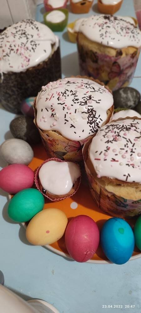 #пасха Ингредиенты: молока, дрожи сухие быстродействующие, сахара, соли, муки, яиц, маргарина, изюма, ванилина Способ приготовления: Все компоненты для теста брать в теплом виде. Молоко (0,5 л) вылить в кастрюлю. Молоко слегка подогреть (температура около 40 градусов).Подготовленное молоко вылить в большую миску, где будет тесто, добавить сухие дрожжи (или 30 г обычных дрожжей), 1/2 стакана сахара, размешать. Муку просеять через сито. К молоку добавить 3 стакана муки, размешать. Накрыть миску полотенцем, поставить в теплое место на 1,5-2 часа (чтобы увеличилось в объеме вдвое). Отделить желтки от белков. К желткам добавить оставшийся сахар – 1,5 стакана.6 желтков растереть с 1,5 стакана сахара добела, добавить ванилин.300 г маргарина выложить в кастрюльку, поставить на огонь. На самом маленьком огне растопить (до теплого состояния). Белки посолить, взбить. Опара к тому времени подошла. В миску к опаре добавить подготовленные желтки, половину маргарина и белки тоже в тесто. Добавить ещё
